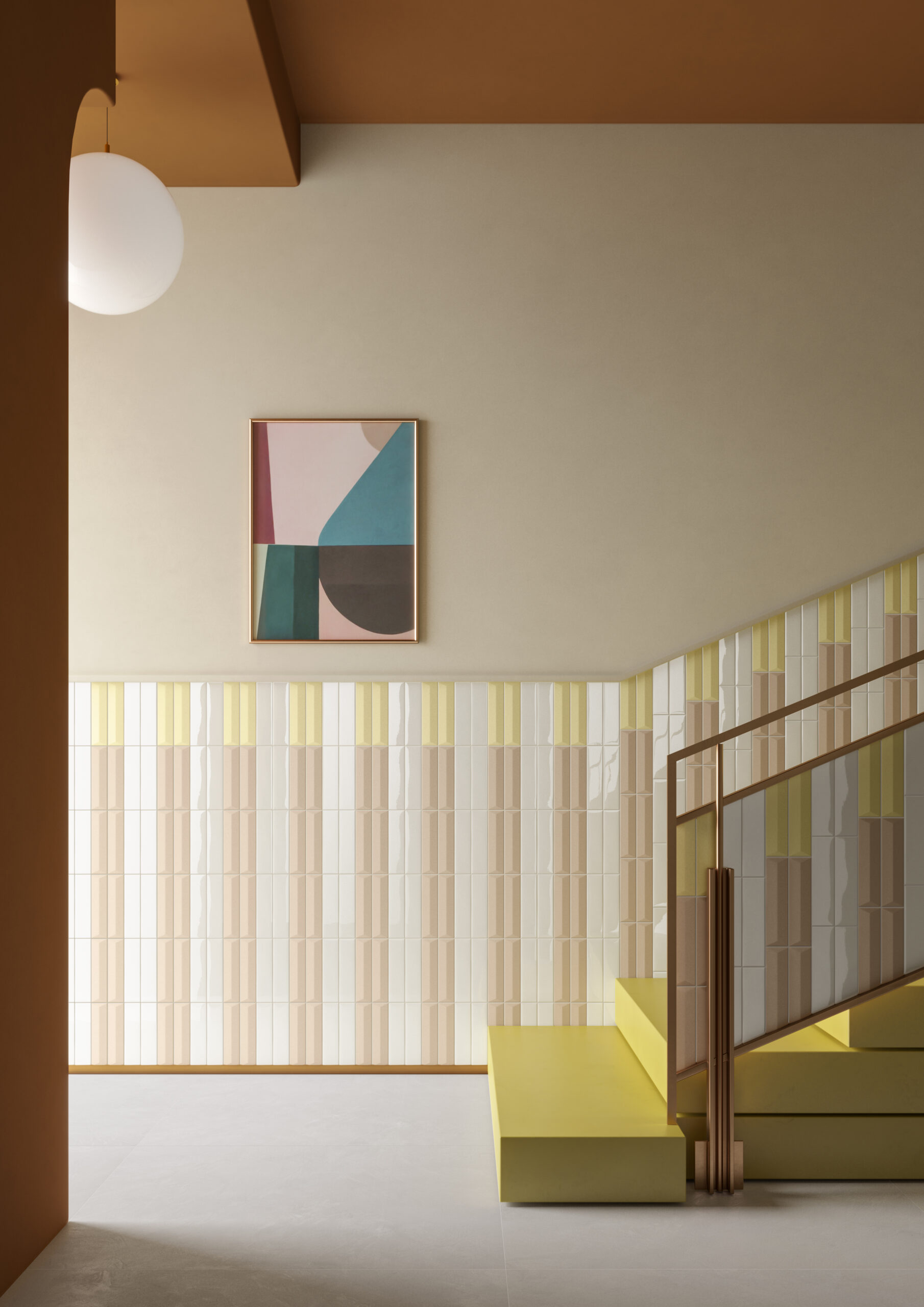 A contemporary ceramic wall tile collection featuring slim brick formats and textured surfaces that add rhythm and dimension to interior spaces.
