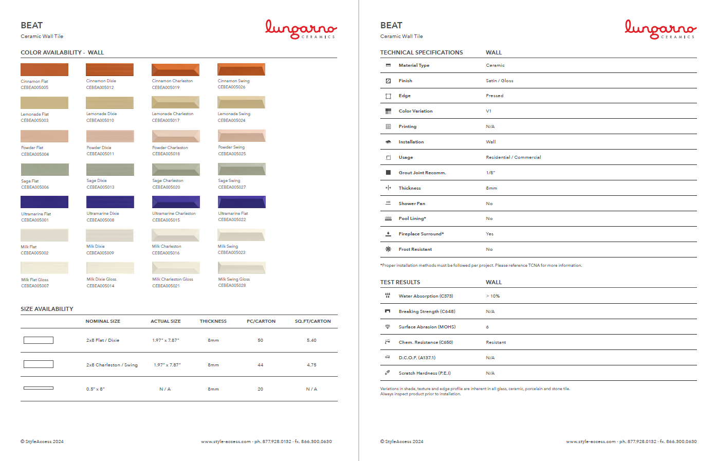 The Beat collection by StyleAccess is a contemporary ceramic wall tile series designed to introduce texture, rhythm, and color into interior spaces. Produced in a slender 2×8” format, the collection offers a versatile brick size that works well in a range of installation patterns including stacked, running bond, vertical layouts, and herringbone designs. Its compact format allows for creative compositions that bring subtle movement and visual interest to backsplashes and feature walls.