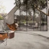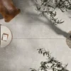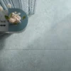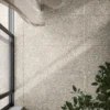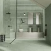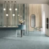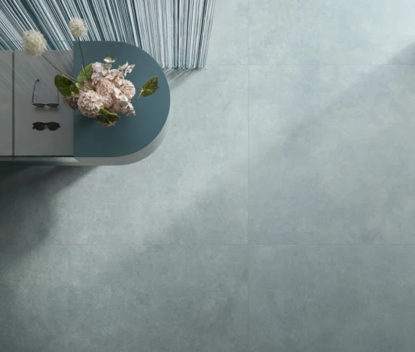 Elegant, contemporary concrete-effect porcelain tiles with dynamic decor items.