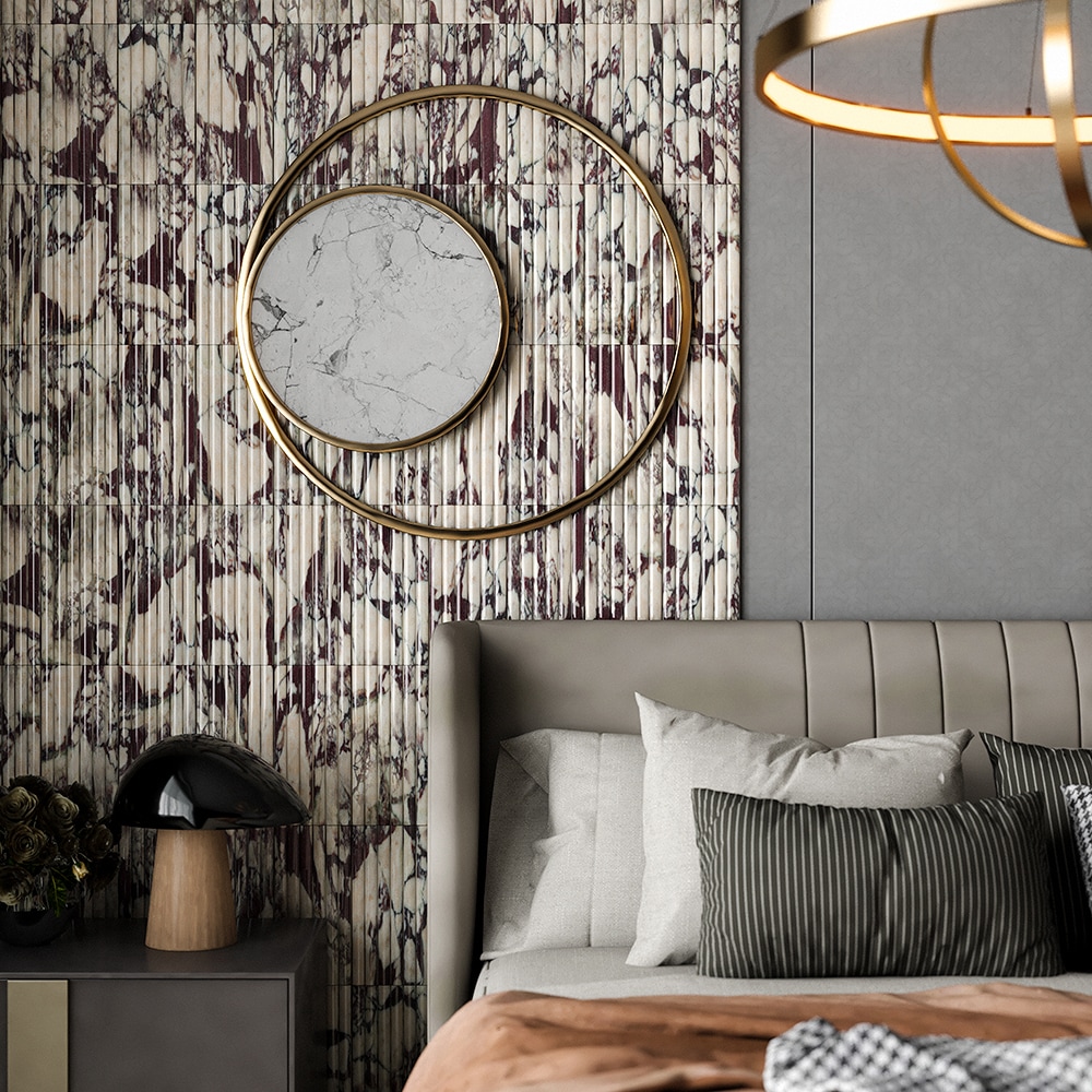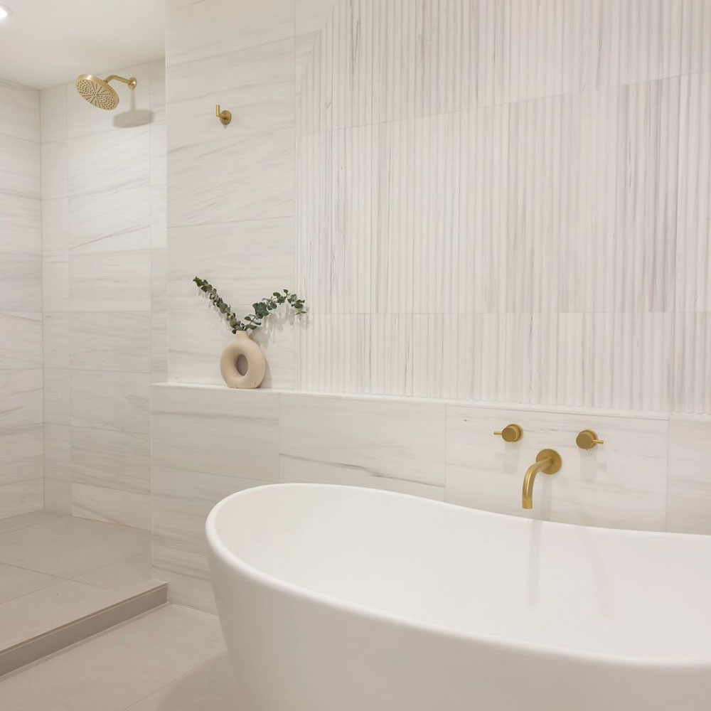 These marble tiles create a visual tour de force of modern design. Our design team curated an assortment of nine of the brand’s most popular classic and exotic marbles. Due to their clean lines, they make an amazing field tile, especially when flipped vertically to create a continuous reeded wall of natural stone.
