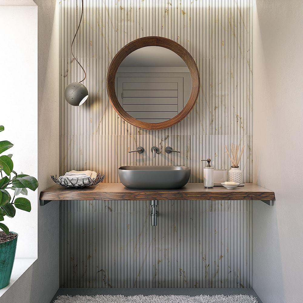 Our Fluted Tile Collection consists of carved stone tiles with a modern edge. They’re a novel way to bring a dramatic look to contemporary rooms. “Flute” refers to a statement-making reeded style that is deeply carved.