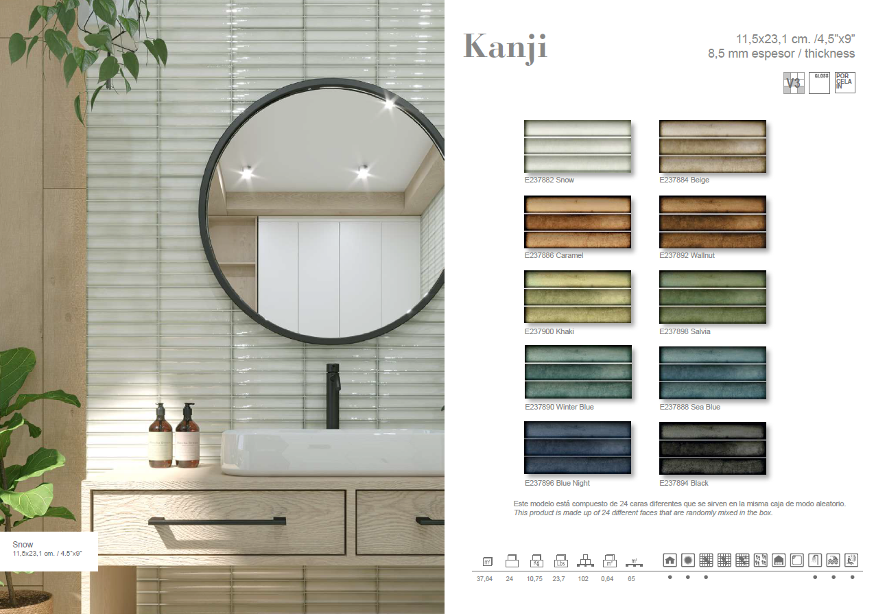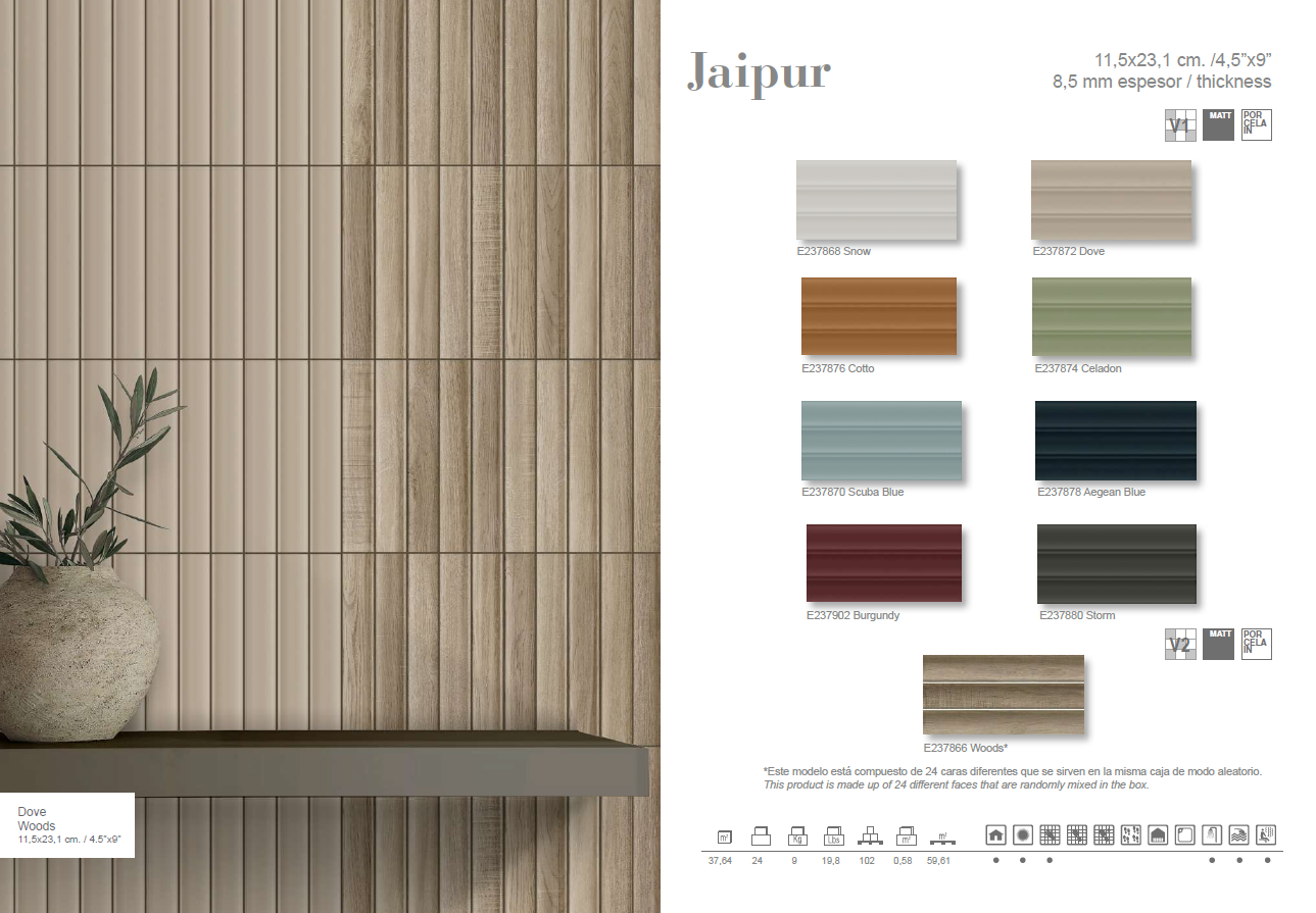 The Kanji-Jaipur collection blends artisanal charm with modern style in a curated range of ten glossy and 9 matte shades. Glossy tiles offer rich depth and luminous shine, while the matte finish features a distinctive three-scottage relief in trend-forward tones. With endless grouting combinations and expressive textures, Kanji-Jaipur brings refined character to any space.