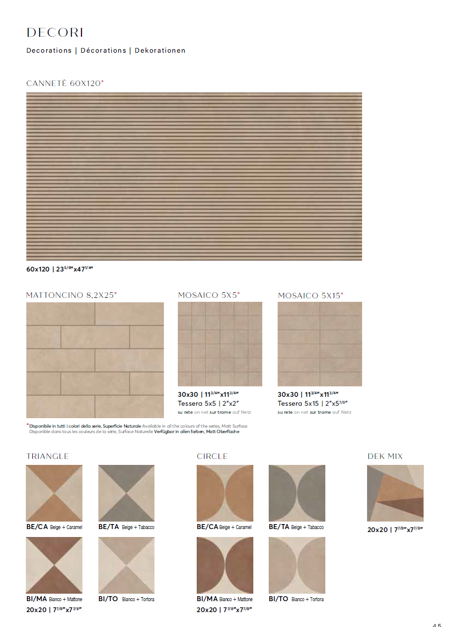 | Item | 3×10 – Naturale – 9mm, 8×8 – Naturale – 9mm, 12×24 – Naturale – 9mm, 12×24 – Grip – 9mm, 24×24 – Naturale – 9mm, 24×24 – Grip – 9mm, 24×48 – Naturale – 9mm, 24×48 – Grip – 9mm, 36×36 – Naturale – 9mm, 48×48 – Naturale – 9mm, 48×110 – Naturale – 6mm, Cannete – Decor, Mosaico 2×2, Mosaico 2×6, 24×24 – Grip – 20mm, 24×48 – Grip – 20mm, Triangle – Beige Caramel, Triangle – Beige Tabacco, Triangle – Bianco Mattone, Triangle – Bianco Tortora, Circle – Beige Caramel, Circle – Beige Tabacco, Circle – Bianco Mattone, Circle – Bianco Tortora, Dek Mix |