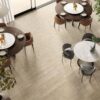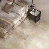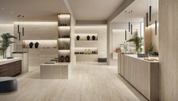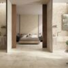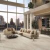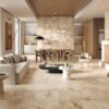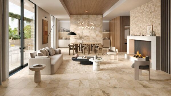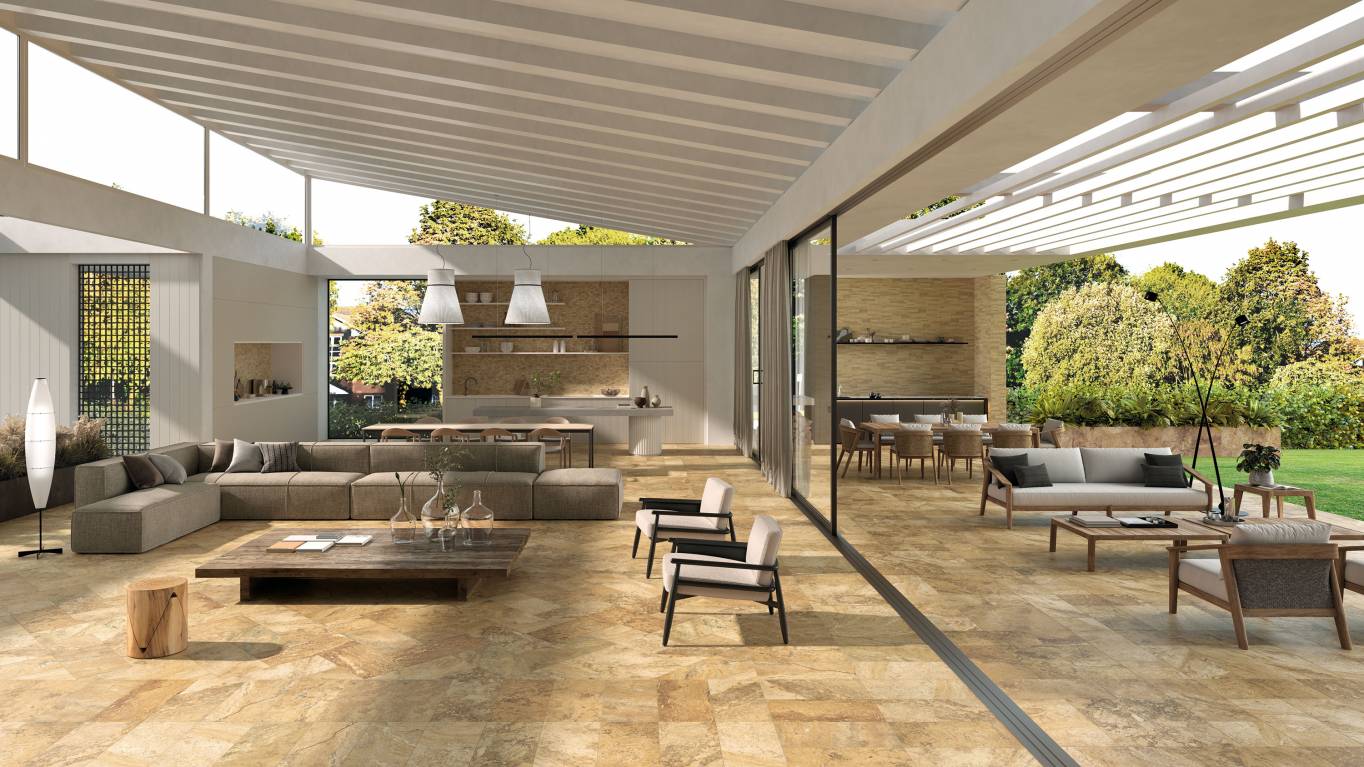 Elegant travertine-effect porcelain tile collection with 20mm paver options.